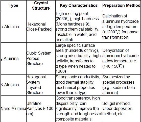 Основна класификација праха глинице заснована је на његовој кристалној структури и процесу припреме. Уобичајени типови и њихове карактеристике су следеће: